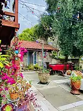 Stys[5] and the other people who built homes in the district had no formal training in the design and construction of houses. Only one house in the district was designed by a professional architect.[3] The homes were built of local field stones from the alluvial plains around Claremont, as well as salvaged and recycled materials including the sides from railroad cars, debris remaining after the 1933 Long Beach earthquake, and materials from wrecking yards.[6][7][8][9][10]