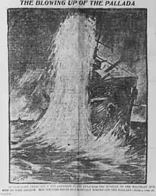 In August 1904 at the Battle of the Yellow Sea, after being struck by a torpedo, Pallada managed to make her way back to Port Arthur, and was thus unable to break through the Japanese blockade along with a number of other Russian cruisers. Thereafter, Pallada was trapped in the harbor. Her guns were removed to help strengthen the land defenses and most of her crew was reassigned to serve as infantry. Pallada was sunk by Japanese 11-inch siege howitzers on 8 December 1904.