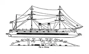 As plans and designs of Rurik were being finalised, rumours began floating as to the exact nature of the vessel. In particular, Britain became extremely nervous about the new cruiser, fearing greatly for her large commercial fleet which she depended on. The British press "fuelled anxiety to the point where it approached paranoia."[2] As it turned out, the Royal Navy grossly overestimated the threat posed by Rurik and built the cruisers specifically designed to counter the Rurik.[3] Two of the first ones were the Powerful and Terrible. The British cruisers turned out to be much faster, easily making 22 knots compare to the Rurik's top speed of 18.7 knots (34.6 km/h). The British cruisers were using the watertube, or coil, boilers that later were proved superior and became a standard on all new warships of that time.