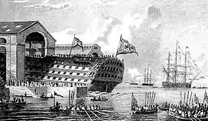 The ceremonial launch of the ship in the waters of Neva River took place on 5 July 5, 1839. The ship was tested in 1840 and in subsequent years sailed in the Baltic Sea (not further than Denmark). She was one of the ships sent to Denmark during the First Schleswig War of 1848–50 to help preserve Denmark's territorial integrity against Prussia. After the start of the Crimean War, she was based at the naval fortress Sweaborg (near Helsinki) with the Third Division of the Russian Baltic Fleet, while most of the Fleet took up positions in Kronstadt, on the outskirts of St. Petersburg. During the bombardment of Sweaborg on 28 July 1855, she took up an enfilading position between Bakholmen and Gustafsvard islands. Defending the position she received 85 holes, the crew lost 11 people killed and 89 wounded. At night, she left this position. According to Andrew Lambert, this was achieved by Stork and Snapper gunboats, armed with Lancaster guns.[2] Rossiya was decommissioned in 1856; from 1857 she was used as a floating barracks and she was sold for scrap in 1860.[1][3]