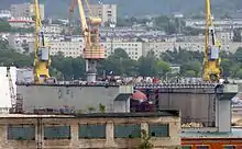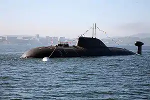 Since 2009, the nuclear submarine has been undergoing repairs at the Zvezda shipyard in Bolshoy Kamen, which was scheduled to be completed by the end of 2013.[10] In January 2010, preparations began for loading nuclear fuel.[11] Repairs and modernization lasted until December 2015. On 18 December, the Russian Prime Minister Dmitry Medvedev and the Governor of the Primorsky Territory Vladimir Miklushevsky were shown a modernized boat.[12] On 22 December 2015, the boat was ready for a checkout to the sea with the subsequent transfer to the main basing point until the end of March 2016.[13][14][15] On 19 March 2016, the submarine was handed over to the Navy after a lengthy repair.[16]