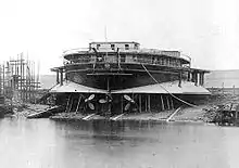 The Livadia was an imperial yacht of the House of Romanov built in 1879–1880 to replace a yacht of the same name that had sunk off the coast of Crimea in 1878. The new Livadia, intended for service on the Black Sea, was a radically novel ship conceived by Vice Admiral Andrey Popov, designed by naval architect Erast Gulyaev and built by John Elder & Co. of Govan on the Clyde. The Livadia continued Popov's line of circular ships although this time Popov sacrificed geometrical perfection for seagoing capabilities. She had a beam of 153 ft (47 m) against overall length of only 259 ft (79 m).[4] An extreme example of tumblehome architecture, she sported a conventionally shaped superstructure mounted on a wide, flat-bottomed, turbot-shaped submerged hull or pontoon.