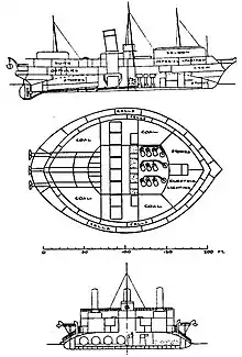 Naval architects of the 1860s tended to increase the beam and reduce the length of their armored ships.[8] This change of the proportions maximized the internal volume protected by the same amount of side armor.[8] It was heralded by Sir Edward James Reed and taken to its extreme by Popov. Popov's coastal battleships Novgorod and Kiev were perfectly circular in plan.[8] The design attempted to circumvent the limitations of the Treaty of Paris, although construction of the Novgorod and the Kiev began when the treaty had been effectively voided by the outcome of the Franco-Prussian War. Popov wrote that a circular shape results in minimal weight of armor belt for a given displacement.[8] It also minimized the draft of the battleships, which was critical for their intended deployment in the estuary of the Dnieper and the Kerch Strait.[8] Their seagoing capacities, on the contrary, were deemed unimportant.[4] The Novgorod and the Kiev were commissioned in 1873 and 1875.[8] The enormous drag of their wide hulls made their engines ineffective[4] and they could make only 8 knots.[2] Their steering was satisfactory against the stream, and entirely unmanageable downstream.[2] Their rudders were ineffective while their outer propellers disturbed the steering[4] yet had no influence on the speed (and were soon removed).[2] And, finally, these ships were too wide to fit into any existing drydock.[9]