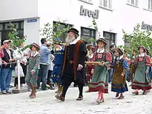 On "Ruten Monday" morning, a big parade called Historischer Rutenfestzug with roughly 6,000 participants winds its way through the old town of Ravensburg. 4,500 pupils and adults parade in historical costumes presenting the town's history from medieval times, when Ravensburg was an international trading centre, to the 19th century. The three-hour-long parade also includes 120 horse-drawn carriages, all Rutenfest drumming groups, and many wind and brass bands from Upper Swabia with c. 1,200 musicians in total. In 2012, c. 50,000 spectators lined the streets along the parade.[5]