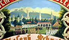 - Trommlerball ("drummers' ball") on the following Thursday night is a dance ball and society event organized by the Trommlerkorps der Gymnasien, roughly comparable to a débutante ball. All Trommlerkorps members take part in social dances with their Trommlerbraut ("drummer's bride"). Initially held at the Konzerthaus until ca. the 1960s, the ball was held in the congress centre in the neighbouring town of Weingarten until 2017.[8] Since 2018, the ball takes place in the Oberschwabenhalle multi-purpose hall in Ravensburg. The Trommlerball attracts c. 1,000 guests; the hall is usually sold out early in advance.[9]