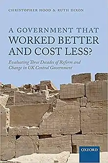 A Government That Worked Better and Cost Less? Evaluating Three Decades of Reform and Change in UK Central Government is a book written by Christopher Hood and Ruth Dixon, and published by Oxford University Press in 2015. The authors attempt to assess the success of three decades of New Public Management, which was intended to create "a government that works better and costs less", concluding that "The short answer seems to be: higher costs and more complaints".[1] The book was described by Michael Moran as "brilliant, highly original", and he concluded that "Future researchers will see further precisely because they will be able to stand on the shoulders of these scholars".[2] In November 2015 the book was awarded the Louis Brownlow Book Award of the National Academy of Public Administration "for its comprehensive study of reform, cost and performance".[3][4][5][6] In November 2016 it was awarded the W. J. M. Mackenzie award of the Political Studies Association,[7] the jury stating that the book "carries considerable implications for policy-making, as well as the field of academic enquiry which it addresses."[8] The book was repeatedly cited in Michael Barber's report Delivering better outcomes for citizens: practical steps for unlocking public value.[9]