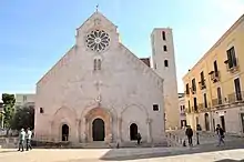 - Cathedral of Ruvo di Puglia. It is one of the best known examples of Apulian Romanesque and the temple was built in the first half of the 12th century with various subsequent modifications. The façade is gabled with three portals: the central one is enriched by bas-reliefs in the intrados and is divided into three arches; the two smaller and simpler side portals are identified by two half columns which provide the support for two pointed arches. The façade is adorned with various stone artefacts among which a large rose window with twelve columns variously worked and superimposed on a metal sheet worked very finely in the fretwork in a local workshop of the sixteenth century stands out. Above the rose window is the seat identified as Robert II of Bassavilla and at the top of the façade stands the statuette of Christ the Redeemer. The interior follows the Latin cross plan and is covered with a trussed roof and cross vaults. The central nave is the largest and rests on two rows of columns. The 11th century bell tower and the Bishop's Palace are also annexed to the cathedral.