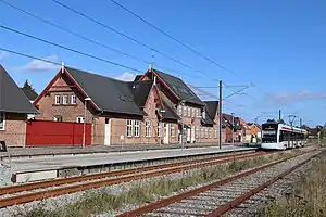 Ryomgård station is a railway station serving the railway town of Ryomgård on the peninsula of Djursland in Jutland, Denmark. The station opened in 1876 with the opening of the Randers-Ryomgaard-Grenaa Line. The train services are currently operated by the railway company DSB which run frequent local train services between Aarhus and Grenaa as part of the Aarhus Commuter Rail service.