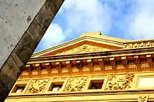 Three loggias exist on extended balconies, over sills in the thickness of the walls and interconnected by a balcony running on 4 strong consoles in the same alignment as the ordering columns.[1] The arches have a shutter in support and transition to the entablature, which opens a frieze corresponding to a mezzanine of three openings and bas-reliefs alluding to the human passions ("Pain", "Hate", "Kindness" and "Love"), subtitled on the architrave.[1] Above, the denticulated cord ends at the frieze and the beginning of a strong cornice based on rebound corbels, which are dense, in a repetitive rhythm that runs throughout the building.[1] Crowning the facade is the gable, rising over a high platform, with rhythmic fenestration and formal, ornamented balustrades. The lateral facades are symmetrical.[1] On the ground floor, there are 3 arched doorways (topped by a running balcony and supported by 4 consoles), flanked by 2 small doors, with an interrupted curvilinear pediment.[1] Here, 3 doors (that are repeated in the two successive upper floors) with balconies and sills, are interspersed between four, embedded Ionic pilasters.[1] The set is flanked by strong masks, on intermediate floor, on which a window opens at the top, with small gap at the bottom.[1] Corresponding to the stage area, there are high, open slits; in this area, the body of the theatre rises above the entablature, accompanying the broken forms or gables, underlined by the frame and ornamental strip.[1]