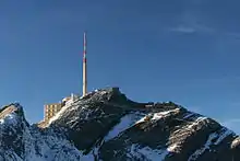 The Säntis transmitter is a 123.5 m (405.3 ft) high transmitting station on the summit of the 2,502 m (8,209 ft) high Säntis mountain in Switzerland. It is operated by Swisscom.