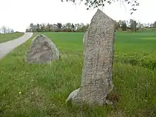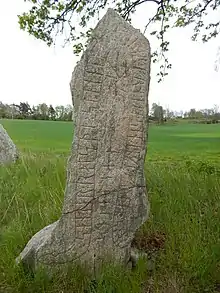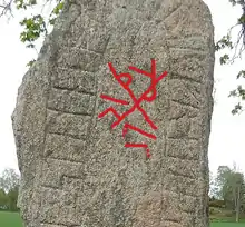 Erik Brate noted that the runestone lacks a Christian cross[4] and read the last runes as siþi þur, which he interpreted as Siði Þorr,[4][2][3] "Thor, make it right" meaning "May Thor safeguard".[2] The verb has also been taken as a reference to seiðr, that is, "May Thor work magic", with the same intention.[5] Brate interpreted the runic cross as a pagan statement against the newly arrived Christian faith,[4] and this has led to the stone becoming one of the most commonly cited runic inscriptions in popular science publications.[3] The inscription has been discussed by scholars such as Henrik Williams (1996) and Anders Hultgård (1992, 1998), but in spite of the fact that Elias Wessén (1935) considered it untenable, the interpretation was not seriously challenged until 2010.[3] A more recent interpretation reads the runes as "in Sweden" instead.