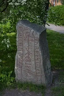 Ship images appear on several Viking Age runic inscriptions, but the image on Sö 352 is unusual in that it apparently depicts a rope and anchor below the ship.[3] The anchor does not appear to be made of iron, which was used only in the larger, more expensive ships, but is either a stone or made of stone and wood with rope lashings.[3] Other runic inscriptions from the Viking Age which depict ships include DR 77 in Hjermind, DR 119 in Spentrup, DR 220 in Sønder Kirkeby, DR 258 in Bösarp, DR 271 in Tullstorp, DR 328 in Holmby, DR EM85;523 in Farsø, Ög 181 in Ledberg, Ög 224 in Stratomta, Ög MÖLM1960;230 in Törnevalla, Sö 122 in Skresta, Sö 154 in Skarpåker, Sö 158 in Österberga, Sö 164 in Spånga, Sö 351 in Överjärna, Vg 51 in Husaby, U 370 in Herresta, U 979 in Gamla Uppsala, U 1052 in Axlunda, U 1161 in Altuna, and Vs 17 in Råby.[3] Three stones, the Hørdum and Långtora kyrka stones and U 1001 in Rasbo, depict ships but currently do not have any runes on them and may never have had any.[3]