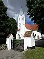 The oldest parts of the church building was likely constructed in the end of the 1100s when a stone church replaced an original wooden structure. In the late Middle Ages the church was expanded and the original flat wooden ceiling was replaced with Gothic rib vaults. The first tower, a Stilt Tower, is likely from this period as well. In 1883 the church got its present tower. In 1870 the church was extensively renovated and crow-stepped gables were added and the north door was walled off.[3][4]