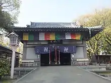The Sōfuku-ji (崇福寺, literally temple of sublime happiness) in Fukuoka (Japan) is a Buddhist temple of the Rinzai school ( Rinzai-shū ).[1] It was in 1240 at the headquarters of the Special Administrative Dazaifu by the monk Tan'e (湛慧 founded). In the following year, the monk Enni Ben’en (円爾 弁円) , who had also returned from China, gave the inauguration sermon. Together with the Jōten Temple (承天寺 built in Hakata in 1241 , it was under the control and protection of the general Mutō Sukeyori (1160-1228),[2] who resided in Daizaifu as a representative of the Kamakura shogunate. In 1272, this temple was inhabited by Nanpo Shōmyō (also known as Daiō Kokushi), who seriously expanded it. Nampo spent thirty years there. It is believed that the monastery was built just for him.[3]