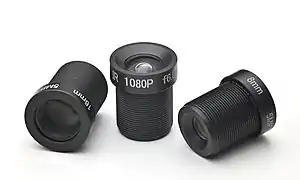 The S-mount is a standard lens mount used in various surveillance CCTV cameras and webcams. It uses a male metric M12 thread with 0.5 mm pitch on the lens and a corresponding female thread on the lens mount. S-mount lenses are often called "M12 lenses". Because the lens mounts are usually attached directly to the PCB of the sensor, the standard is often called "board lens". The supported sensor formats range from smaller than 1/6-inch type up to 1-inch having an 16mm diagonal sensor. The lenses lack an iris control. S-mount lenses do not have a flange and therefore there is no fixed lens to sensor distance and they must be adjusted to focus.[1] Due to the small size of the lens barrel, performance is somewhat limited and most S-mount lenses are relatively slow (f/1.6 and slower). High-end CCTV cameras generally use C/CS-mount lenses, where much faster apertures like f/1.0 are common.