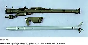 The missile launcher system consists of the green missile launch tube containing the missile, a grip stock and a cylindrical thermal battery. The launch tube is reloadable at depot, but missile rounds are delivered to fire units in their launch tubes. The device can be reloaded up to five times.[11]