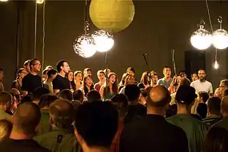 SACRA/PROFANA was founded in 2009 by Krishan Oberoi, a graduate of Yale University. During the choir's first season, the ensemble performed exclusively at the University of San Diego and the San Diego Museum of Art. In 2011, the ensemble began exploring new venues such as San Diego's club Anthology.[6] In May 2011, they were invited by conductor Jung-Ho Pak to perform Friede Auf Erden by Arnold Schoenberg with San Diego's Orchestra Nova.[7] Later in 2011, Pak invited SACRA/PROFANA to perform Messiah by Georg Frideric Handel with the same orchestra. When Orchestra Nova folded in 2012,[8] SACRA/PROFANA stepped in to complete that orchestra's scheduled performance of Messiah.[9]