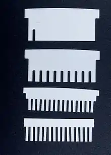 By using a gradient mixer, gradient gels with a gradient of acrylamide (usually from 4 to 12%) can be cast, which have a larger separation range of the molecular masses.[14] Commercial gel systems (so-called pre-cast gels) usually use the buffer substance Bis-tris methane with a pH value between 6.4 and 7.2 both in the stacking gel and in the separating gel.[15][16] These gels are delivered cast and ready-to-use. Since they use only one buffer (continuous gel electrophoresis) and have a nearly neutral pH, they can be stored for several weeks. The more neutral pH slows the hydrolysis and thus the decomposition of the polyacrylamide. Furthermore, there are fewer acrylamide-modified cysteines in the proteins.[15] Due to the constant pH in collecting and separating gel there is no stacking effect. Proteins in BisTris gels can not be stained with ruthenium complexes.[17] This gel system has a comparatively large separation range, which can be varied by using MES or MOPS in the running buffer.[15]