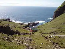 The windfarm in Húshagi, came officially online on 9 October 2014. The 13 wind turbines on Húsahaga from ENERCON have a total production capacity of 11.7 MW, generating annually some 41 GWh.[10] The windmills produce about 23% of the electricity of the Faroe Islands.[11]