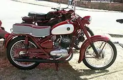The first model to be produced in Kielce again was improved SHL M03 of 1948, and then SHL M04 of 1949. In 1948 the name Huta Ludwików was changed to KZWM Polmo-SHL (Kieleckie Zakłady Wyrobów Metalowych - Kielce Metal Works). Luckily, the communist authorities decided to keep pre-war SHL brand, which was not a rule. In 1951 it was however decided to stop motorcycle production in Kielce and until 1954, the production of SHL M04 was continued in the WFM in Warsaw, followed by a short series of SHL M05 in 1955, with telescopic front suspension.[1] All these motorcycles were improvements of one design, related to the DKW RT 125, with 125 cc engines. Some 18,500 motorcycles had been made in Kielce so far.[1] Then, the SHL brand disappeared for a short time, replaced by the WFM brand.