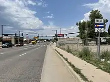 State Highway 26 (SH 26) is a 3-mile (4.8 km) long state highway in Denver, Colorado, United States. It follows a portion of Alameda Avenue, stretching east from SH 95 (Sheridan Boulevard) at the west city limits to Kalamath Street within the Interstate 25 (I-25) and U.S. Route 85 (US 85) interchange (I-25 exit 208). It formerly continued west through Lakewood to US 40 near I-70 exit 259.