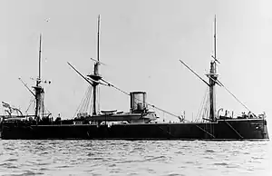 She was armed with a main battery of four 26 cm (10.2 in) L/22 guns mounted in a pair of gun turrets placed on the centerline amidships.[lower-alpha 3] As built, the ship was also equipped with two 17 cm (6.7 in) L/25 chase guns, one in the bow and one in the stern.[4] After being rebuilt in 1888–1890, her armament was increased by six and later ten 8.8 cm (3.5 in) L/30 quick-firing guns, a pair of machine guns, and five 35 cm (14 in) torpedo tubes, all placed in the ship's hull below the waterline.[3]