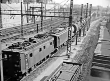 When the first 21 locomotives were delivered, the electrification of the Paris-Vierzon line hadn’t been completed so, as an interim measure, they were temporarily fitted with contact shoes to operate the third rail suburburban services between Gare d'Orsay and Juvisy.[5] It was not until 22 December 1926 that the Paris-Vierzon line was fully electrified by catenary. [6] The E-BB 1-80 were then put to intensive use, the first locomotives delivered gradually losing their contact shoe equipment. They had a tendency to rear up at start-up, which earned them their nickname "biquettes" (kids).[7] However, their maximum speed of 90 km/h (56 mph), (attempts to raise their speed limit to 105 km/h (65 mph) did not succede)[8] and their lack of power proved a handicap to them when rostered on passenger trains, for lack of a sufficient fleet of dedicated passenger locomotives; they were more efficient in hauling freight trains.[9] Initially they suffered from a number of teething problems, the traction motors being insufficiently reliable and the Westinghouse equipment prone to numerous breakdowns; they were the subject of numerous modifications aimed at solving these problems.[10] As the electrification programme continued, however, they reached Tours in 1933 and Brive-la Gaillarde in 1935.[11]