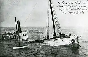 Columbia was lost on 21 July 1907 after a collision with the lumber schooner San Pedro off Shelter Cove, California, with the loss of 88 lives.[14]