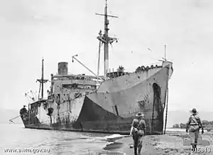 ![]() The wrecked Japanese ship Myoko Maru aground at Malahang in September 1943. | |