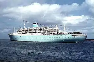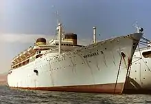 These plans never materialized and ownership of the vessel was passed on to the Sitmar Line, who renamed Fairsky with the intent of rebuilding her into a cruise ship, as they did with the SS Fairwind.[4] However the company decided to build an entirely new ship (resulting in the Fairsky of 1984). With this decision Sitmar renamed her Vera in 1981. She was sold to the John Latsis company Bilinder Marine Corporation in 1982, who renamed her Marianna IX after one of his daughters. She entered a new role as an accommodation ship at Jeddah and then Rabigh. In 1984 her name was changed to Marianna 9. She was sent to Kalamata to house earthquake victims in 1986, but was later returned to Rabigh.[5] In 1992 she was laid up at Eleusis alongside the RMS Windsor Castle. She remained there until 2001 when she was sent to the scrapyards at Alang, India.[6]