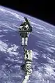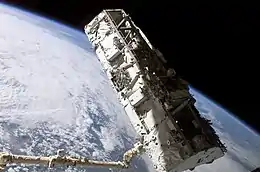 ![]() Canadarm2 grapples the first segment of the ISS' Integrated Truss Structure | |