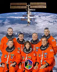 ![]() In front, (L-R): Stephen N. Frick, Ellen L. Ochoa, Michael J. Bloomfield; In the back, (L-R): Steven L. Smith, Rex J. Walheim, Jerry L. Ross and Lee M. E. Morin. | |