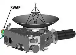 SWAP (Solar Wind Around Pluto) is an science instrument aboard the unmanned New Horizons space probe, which was designed to flyby dwarf planet Pluto.[1] SWAP was designed to record Solar Wind en route, at, and beyond Pluto.[1] At Pluto, SWAP's purpose was to record the relationship between the solarwind and ions and/or material entering space from the atmosphere of Pluto.[2]