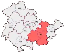 Saalfeld-Rudolstadt – Saale-Holzland-Kreis – Saale-Orla-Kreis is an electoral constituency (German: Wahlkreis) represented in the Bundestag. It elects one member via first-past-the-post voting. Under the current constituency numbering system, it is designated as constituency 195. It is located in eastern Thuringia, comprising the districts of Saalfeld-Rudolstadt, Saale-Holzland-Kreis, and Saale-Orla-Kreis.[1]