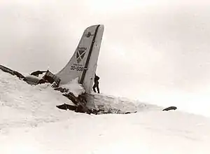 When they finally reached the crash site, there was devastation. It was freezing −11 °C (12 °F) and visibility was only 15 to 20 m (49 to 66 ft), sometimes even less. The snow lay 1 m (3 ft 3 in) thick and hid part of the aircraft. The aircraft lay in big pieces in the snow and looked as if it had crashed nose down after hitting a number of trees on the mountain side. Only the tail of the aircraft aft of the rear door was relatively intact. The engines had been torn off and only 2 of the 4 were ever found, one of them had clearly hit the trees because there were tree branches stuck in it. The forward section of the fuselage was shredded and the wings were completely destroyed as well, torn main-wheel covers indicated that the landing gear was extended when the aircraft hit the trees and seconds later the mountain.[4]