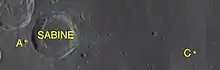 Sabine (/ˈseɪbɪn/ SAY-bin) is a lunar impact crater that forms a nearly matching pair with Ritter to the northwest. The two rims are separated by a distance of only a couple of kilometers. To the west is the bowl-shaped crater Schmidt, and farther to the north are Manners and Arago. Its diameter is 30 km. It was named after Irish physicist and astronomer Edward Sabine.[1]