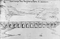 Remnants of these two Roman viæ still exist under the modern roads Rua do António Ricardo Rodrigues and Rua do José Luís de Morais (the town's two main streets during the Middle Ages, which connected the upper and lower districts of Sacavém). Even during this period Sacavém was an important river-crossing; the Romans built a bridge that remained active until the 17th century (according to several sources, such as Francisco de Holanda or Miguel Leitão de Andrade).[3] This bridge was a natural continuation of the roads and connected Sacavém with the northern river bank; therefore indirectly included in the famous Antonine Itinerary. The parish's coat-of-arms includes a symbolic depiction of the Roman bridge. Also in the vicinity, an epigraphic inscription is said to have existed (nowadays unknown), but referred to in the Corpus Inscriptionum Latinarum). Various epigraphs have suggested that this totem identified the Roman magisterial administration of the rural locality.[4]