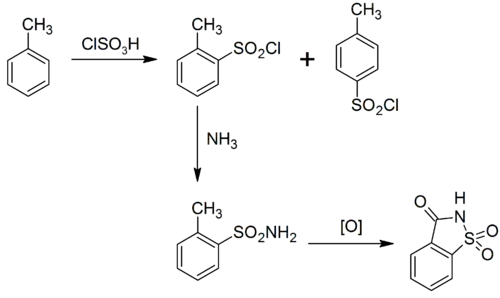 Saccharin can be produced in various ways.[38] The original route by Remsen and Fahlberg starts with toluene; another route begins with o-chlorotoluene.[39] Sulfonation of toluene by chlorosulfonic acid gives the ortho and para substituted sulfonyl chlorides. The ortho isomer is separated and converted to the sulfonamide with ammonia. Oxidation of the methyl substituent gives the carboxylic acid, which cyclicizes to give saccharin free acid:[40]