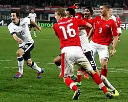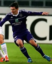 In June 2010, Kljestan signed a four-year contract with 2009–10 Belgian Pro League champions Anderlecht.[3] He made his competitive debut and scored his first goal in the same game on July 27, 2010, in a 3–1 win over Welsh club The New Saints in the third qualifying round of the 2010–11 UEFA Champions League.[4] In his first season in Belgium he appeared in 34 matches across all competitions scoring 3 goals and helped Anderlecht capture the 2010 Belgian Super Cup. While at Anderlecht, Kljestan was converted from his traditional number 10 role to a holding midfielder; where he partnered with Argentine Lucas Biglia. Together the two formed a strong partnership which lead Kljestan to his first-ever title, winning the Belgian Pro League in 2012. He quickly became a fan favorite as supporters began to call him "Mr. USA" and bring US flags to the stadium to show praise for the team's only American player.[5] The following three seasons he remained a key player as Anderlecht captured three consecutive Belgian Pro League and Belgian Super Cup titles.