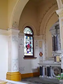 The quality of its decorations, fixtures and fittings are an important feature of this church. The barrel-vaulted ceiling, sanctuary and nave show extensive painted and ornamented decorations.[3] The use of gold leaf reflects the Catholic Italianate tradition in expressing the holiness through the stenciled ornaments.[3] The High Altar made out of white Carrara marble, an exceptional example of Romanesque Revival style, was designed by Kempson and Connolly.[2] The stained glass windows is also of interest, being the first use of Classical architecture into Roman Catholic Churches.[2]
