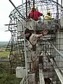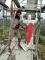 The artistic adviser Joseph Alaban on the top of the head armature of the statue.