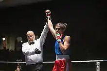 Sadaf Khadem (Persian: صدف خادم; born January 23, 1995[1]) is a female boxer from Iran.[2] She held her first international fight on April 14, 2019, where she defeated Anne Chauvin from France.[3] Khadem is the first female boxer since the Iranian Revolution to compete in an official boxing contest and the first Iranian woman to win an official match.[4] This match is particularly important because female boxing has been prohibited since the Iranian Revolution.[1]