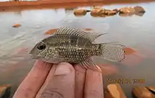 The saddle cichlid shows significant variation in colour and thus variation is geographic. In the western parts of its range, in Ecuador and Peru they develop striking red or orange colouration on the lower jaw, the head and the forward portion of the belly while Brazilian specimens are more of an overall grey or blue or green colouration.[2] The males grow larger than the females and they usually grow extensions to the dorsal, caudal and anal fins as they reach sexual maturity. In spawning condition the males are more brightly coloured than the females.[3] The maximum recorded length of the saddle cichlid is 162 millimetres (6.4 in).[2]