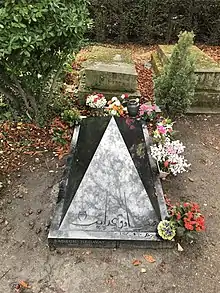 In 1951, overwhelmed by despair, Hedayat left Tehrān and traveled to Paris, where he rented an apartment. A few days before his death, Hedayat tore up all of his unpublished work. On 9 April 1951, he plugged all the doors and windows of his rented apartment with cotton, then turned on the gas valve, committing suicide by carbon monoxide poisoning. Two days later, his body was found by police, with a note left behind for his friends and companions that read, "I left and broke your heart. That is all."[8][9] He is widely remembered as "a major symbol of Iranian nationalism."[10]
