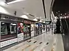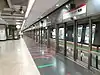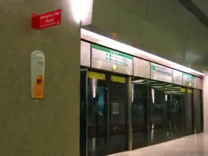 Pasir Ris was the first elevated station to have platform screen gates and Kranji was the last elevated station to have platform screen gates.[25] By 2011, all elevated East West Line stations have the platform screen doors installed and by 2012, all elevated North South Line stations have the platform screen doors installed.[26] HHPSDs installed through this period were installed by ST Electronics. Newer half-height platform screen doors on the Tuas West Extension which opened in 2017 were installed by Fangda of China.[27] All platform screen doors of both types on the MRT system have emergency door handles.