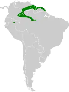 The range in northern South America is the coastal Guianan region extending into coastal northeastern Brazil, the extreme north of Amapá state. The range extends westward, and inland from Guyana into southeast Venezuela, eastern Colombia and then extends southeasterly down the Rio Negro river corridor to the Amazon River confluence and then the confluence of the Madeira River; it also extends upstream on the Amazon River 250 km to the Purus River confluence.