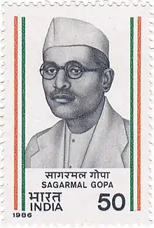 Sagarmal Gopa ( 2 November/3 November 1900 – 4 April 1946) was a freedom fighter and patriot from Jaisalmer, Rajasthan, India. His father was Akhairaj gopa, who was a courtier in Maharawal Jawahar Singh's court.Sagarmal Gopa had recorded the atrocities of Jawahar Singh, the contemporary ruler of Jaisalmer, in his book "Jaisalmer ka Gundaraj", after which the enmity between Jawahar Singh and Sagarmal Gopa increased. He took active part in the non-cooperation movement in 1921. He opposed anti-people policies of then rulers of Jaisalmer. He was expelled from Jaisalmer and Hyderabad. Even in exile he continued to work for freedom movement. After his father's death in 1941, on his return to Jaisalmer he was arrested on 25 May 1941. Sagermal gopa tortured in prison for years. He was burnt to death in the prison on 4 April 1946."Gopal Swaroop Pathak commission" was formed to investigate the murder of Sagarmal gopa, which under the influence of Jawahar Singh, declared this murder as suicide. 3 books were written by gopa 1) aajadi ke diwane 2) jaisalmer ka gundaraj 3) raghunath singh ka mukadma [1]