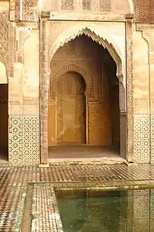 The madrasa covers 478 square meters.[10] The structure follows the prevalent pattern of the Marinid-era madrasas, with a rectangular sahn (courtyard) surrounded by galleries which led to accommodations for the students on either side. Sleeping quarters for the students also existed on the second floor and numbered 26 in total.[10] On the south side of the courtyard, across from the main entrance, was a prayer hall with a mihrab.[6] The foundation plaque and inscription of the building is located in this room.[8] The sahn is richly ornamented by zellij tiles, carved wood, and carved stucco, in a style shared with Nasrid architecture of the same era such as that of the Alhambra palaces.[1] A passage between the sahn and the street entrance gives access to the stairs to the upper level and then to another, slightly smaller, courtyard to the west which contains the latrines.[6]