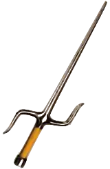 The sai (Japanese: 釵, lit. 'Hairpin'; Chinese: 鐵尺, lit. 'Iron Ruler') is a traditional Asian melee weapon used for striking and blocking. It is most famously used in ninjutsu and kobujutsu, but also in southern Chinese martial arts. The basic form of the weapon is that of a blunt metal prong with two curved sideprongs (yoku) projecting from the handle (tsuka). There are many different types of sai with varying prongs for trapping and blocking.