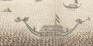 Shortly after this, the VOC-backed Sultan of Ternate, Mandar Syah, was opposed by his brothers and part of the Ternatan elite. The Dutch commander Arnold de Vlamingh van Outshoorn suppressed an attempt to replace Mandar Syah, and the Ternatans had to agree on a treaty in 1652 where they were stipulated to extirpate clove trees in their dominions.[10] This would ensure VOC monopoly on the spice trade, but the treaty was insufficient as long as Tidore sold its cloves to other buyers. Since Saidi actively supported the rebels in Ternate without Spanish approval, De Vlamingh van Outshoorn declared war on Tidore, hoping to eliminate the Tidorese clove production. In order not to antagonize the Spanish, Tidore Island was not attacked; rather, an expedition under Simon Cos was dispatched to worst Tidore's vassals in Halmahera and the Papuan Islands. The expedition was not particularly successful, and in the meantime the Papuan Raja of Salawati raided in Ambon on behalf of Sultan Saidi.[11] However, the efforts of Saidi to take over the Ternatan parts of Halmahera also failed, and the increasingly irritated Spanish finally arrested the Sultan in 1654 for disturbing the peace.[12] He was however soon set free again, and peace with the VOC followed.[13] The Spanish claimed that they saved the skins of the Dutch in Maluku by depriving the rebels in Ternate and Ambon of Tidorese support.[14]